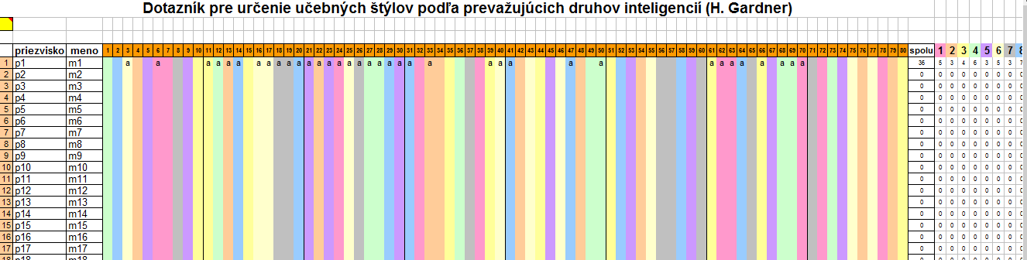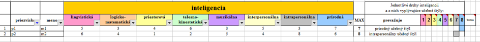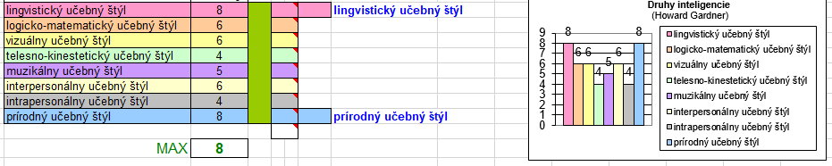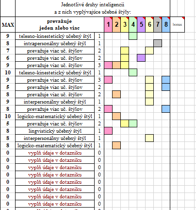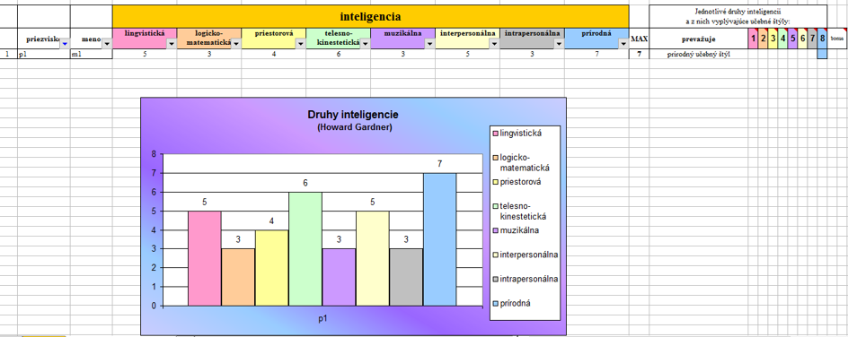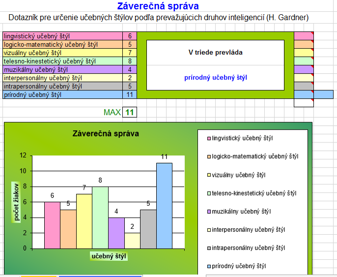 Na tejto stránke (pod textom) sa nachádza program vytvorený v prostredí MS Excel, ktorý zisťuje učebné štýly podľa prevažujúcich inteligencií podľa H. Gardnera.