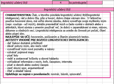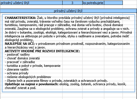 Keďže všetky údaje vyhodnocuje tabuľka a prehľadne spracováva stĺpcový diagram, bola by škoda to nevyužiť aj pre tlač. Pretože ak by sme mali výsledky žiakovi iba prečítať, tak o týždeň si vôbec nemusí pamätať ani to, že sme sa rozprávali o nejakých učebných štýloch. Výsledky sa vytlačia, žiakovi sa lístoček odovzdá a môže si ho poprípade nalepiť do žiackej knižky (alebo na iné vhodné miesto v prípade, že škola už žiacke knižky nepoužíva). Je to výhodné mať to k nahliadnutiu, pretože ani pedagóg si nemusí pamätať každého individuálne výsledky a tieto zistenia môžu využiť aj iní vyučujúci. Samozrejme žiakovi a ani pedagógom nestačí vedieť aký učebný štýl prevláda. Je dôležité poznať jeho charakteristiku. Povedať žiakovi - dať mu návod - ako sa má učiť. A práve posledný hárok s názvom tlač-popis Obr. 10 obsahuje charakteristiku jednotlivých učebných štýlov, kde a ako sa najlepšie učí, aké aktivity sú vhodné pre rozvoj konkrétnej inteligencie a v akých povolaniach sa môže žiak uplatniť. Pri každej charakteristike je na začiatku zobrazené číslo - počet, koľko žiakov sa vyskytuje s touto charakteristikou a koľko tým pádom potrebuje výtlačkov. Nemusí tak manuálne počítať, koľko ktorých výskytov tam má.